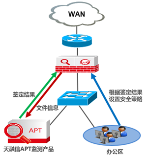 APT监测产品与防火墙联动,为防火墙提供文件安全属性,增强防火墙的威胁检测与阻断能力,有效阻断内部、外部威胁,增强整体安全防护效果。