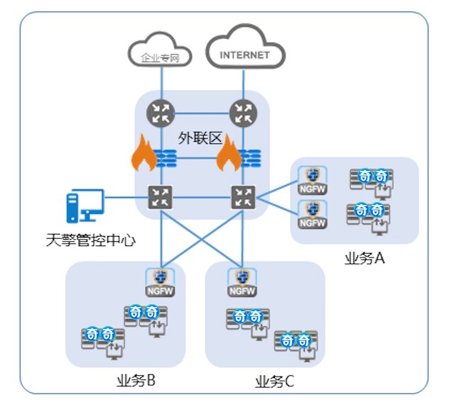 深度集成IPS功能,在网络边界阻断针对业务系统和应用的漏洞利用攻击;双向检测间谍软件植入和信令通道,及时阻断服务器受控后的恶意行为;基于虚拟系统(VSYS)划分,满足数据中心多租户、多业务隔离的需求;与外部安全设施展开智能协同,预警、检测已绕过防护的高级威胁活动。