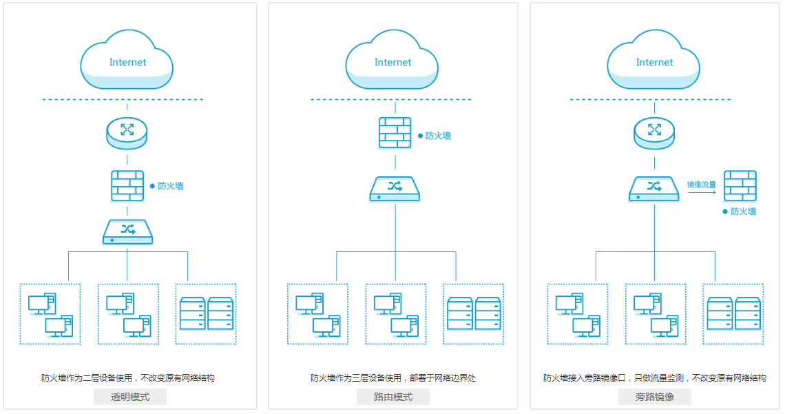 支持多种形式灵活部署,具备负载均衡、NAT、IPv6支持、VPN、VSYS、HA等功能,并可防护扫描、泛洪、异常数据包等传统网络攻击。