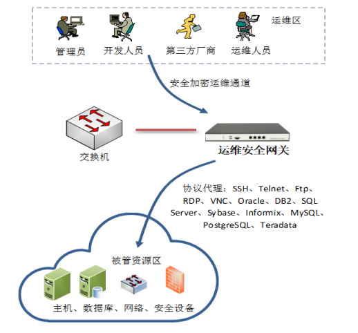 运维安全网关旁路方式部署于网络中,无需对网络结构进行任何调整。运维人员直接访问运维安全网关的对应端口,建立安全加密的数据通道,然后发起到服务器对应服务的访问,无需直接访问服务器,从而进一步加强内部数据访问的安全性。