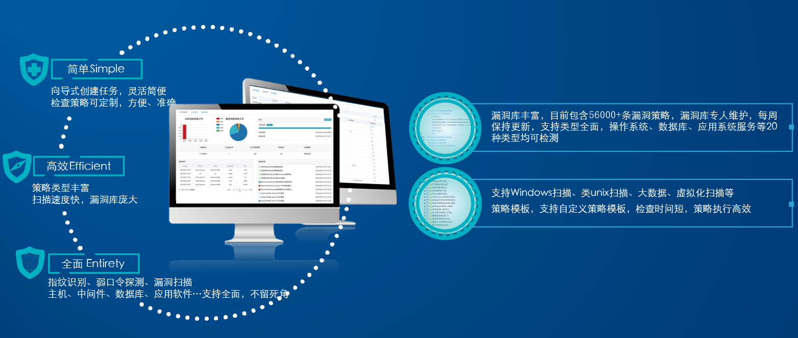 集成系统主机扫描、Web应用扫描、数据库扫描、基线配置核查于一体,方便用户从多维度对目标系统进行安全性评估